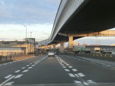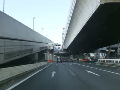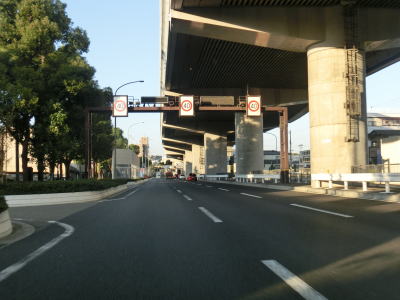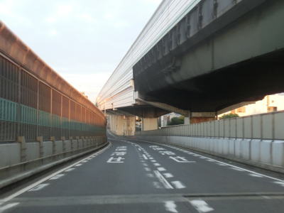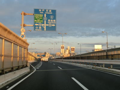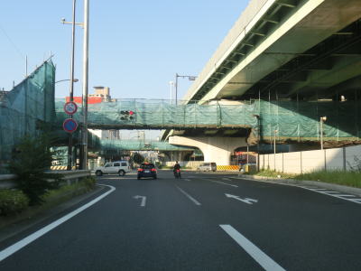 | 高架道路を走った場合は此花区内は全て高架区間となっており交差点が存在しない。高架から下りられないのだからUSJに行く事もできない。淀川に架かる新伝法大橋の東側には伝法大橋が隣接しているが、上下線で別々の橋ではなく新伝法大橋が高架道路、伝法大橋が平面道路としての橋である。 新伝法大橋を渡り終え、福駅付近の緩やかな左カーブの途中で側道が分岐する。大阪r10大和田西交差点に至る側道である。大和田西交差点を高架でパスすると左側から平面道路の2車線が並走してきて、中島大橋を過ぎてから合流する。一時的に片側4車線となるも中島大橋で左端車線が減少して片側3車線になる。 |