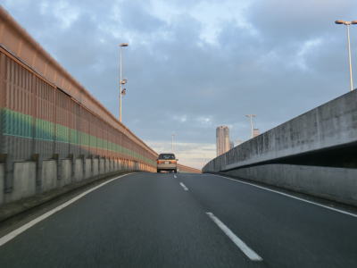 | 兵庫r722深江交差点を通ってから程なくして深江入口を通過する。その後魚崎出口と合流した直後に住吉川を渡って六甲ライナーの下を通過する。R43尼崎以西の区間の特徴のひとつとして遮音壁の多さが挙げられる。これも沿線の住環境改善の一環で、ただの遮音壁ではなく位相の音を発生させて騒音を低減する装置を仕込まれた遮音壁もあるらしい。しかし、道路を走っている限りはどれがその装置なのか発見する事はできなかった。遮音壁とともに街路樹等の緩衝緑地も設けられている。また、夜間は3t以上の貨物車両は中央寄りの車線を走らなければならないが、規制時間帯意外でも中央寄りを走る事が推奨されている。 | ||