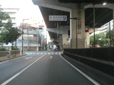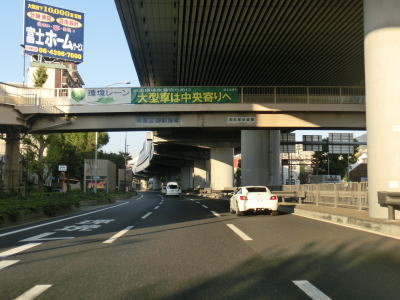 | 阪神高速西大阪線の橋脚に上下線を分離されて片側3車線道路を走っていると左端車線が側道で右側の2車線が高架に上る。この尻無川を渡る高架橋区間も2車線のうちの右側車線が阪神高速の大正西入口になってしまうため左側車線を走っている必要がある。 | ||