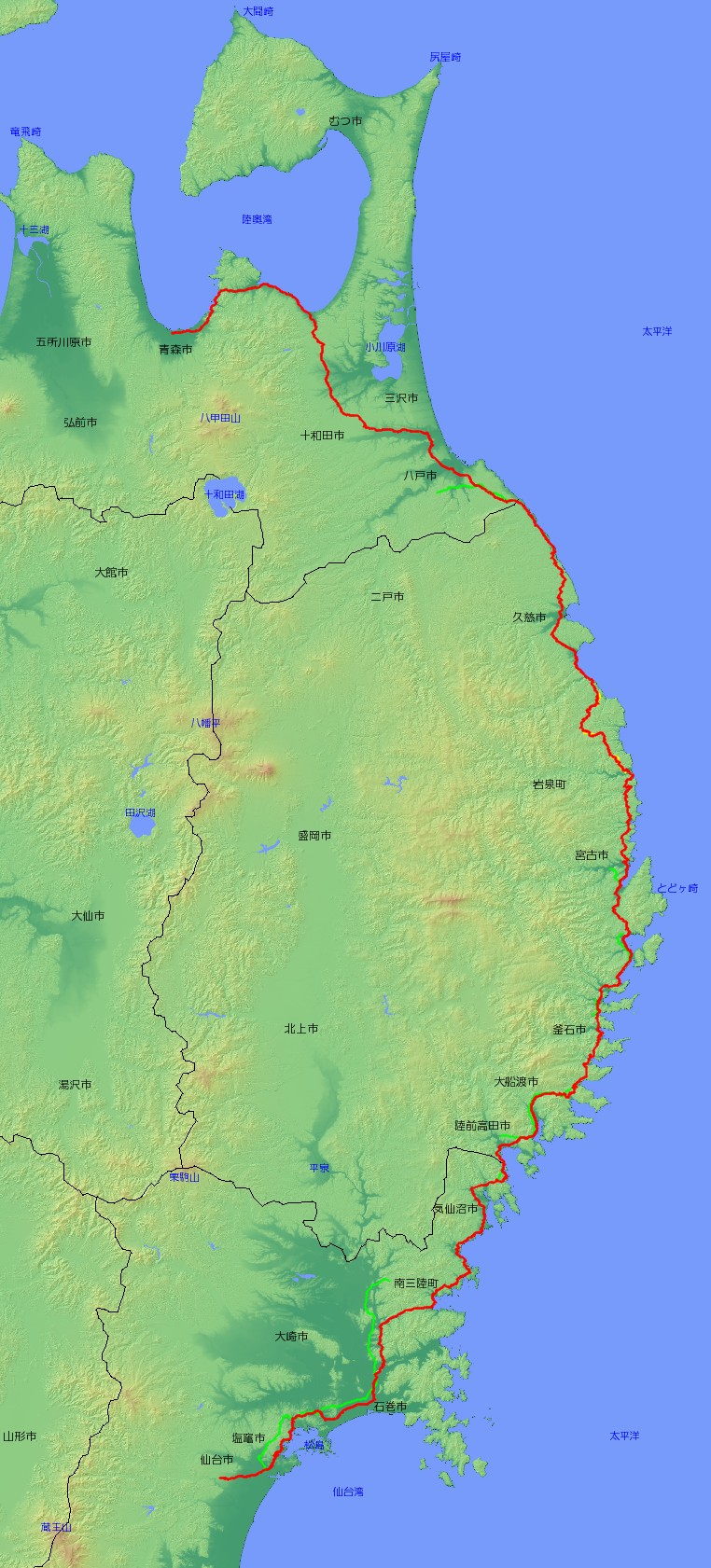 | 主な経由地 | 宮城県仙台市〜多賀城市〜塩釜市〜松島町〜石巻市〜登米市〜南三陸町〜気仙沼市〜 〜岩手県陸前高田市〜大船渡市〜釜石市〜宮古市〜岩泉町〜久慈市〜 〜青森県おいらせ町〜十和田市〜七戸町〜野辺地町〜青森市 |