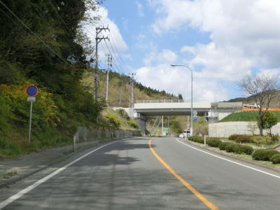 | 浄土ヶ浜西口交差点からしばらくは緩やかな上り勾配だが、程なくして下り勾配になる。建設中の跨道橋の下を通過するが、これはR45三陸道の本線でもインターの流出路でもなく、宮古北IC(仮称)とR45を結ぶために造られている市道である。 緩やかなカーブを描く緩やかな勾配の2車線道路を下っていく。宮古市の市街地から浄土ヶ浜西口交差点にかけてはそれなりの交通量があったが、既にその数も減って快走できる。下りだけでなくアップダウンしている道路を走っていると岩手r259崎山交差点を通過する。 |