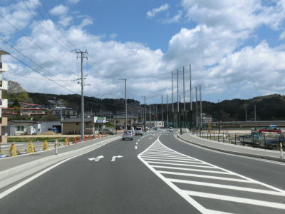| 茂師橋からの上り勾配を走っていると左にカーブして小本トンネルをくぐり、緩やかに下っていく。小本集落を前方に眺めながら勾配を下っていると集落に入る手前で津波浸水区間に入る。 | ||