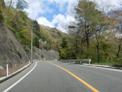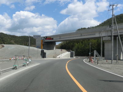 | 摂待トンネルを出て少し走ると建設中の三陸北道の跨道橋の下を通過して右にカーブする。カーブの先で小成川を渡るが、その川が宮古市と岩泉町の境であり橋を渡ると岩泉町に入る。そして岩泉町側には三陸北道の跨道橋が建設中である。おそらくここに岩泉南IC(仮称)が接続するものと思われるが、通行時点では本線の跨道橋は確認できたもののインターチェンジらしき道路は確認できなかった。岩泉南IC(仮称)からは小成川の左岸の平坦な快走路を走る。 | ||