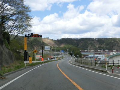 | 田老トンネルを出てからは下り勾配が続いている。左にカーブした後に右にカーブして田老橋を渡るが、その手前に1933年(昭和8年)の三陸大津波の津波浸水区間を示す標識が立てられている。2011年(平成23年)の東日本大震災の津波浸水区間の起点はそれよりも約200m南にある。田老橋からは緩やかな勾配を下り、三陸鉄道北リアス線の田老駅の東で岩手r177交差点を通過する。 さらに進むと防波堤の端を通って平地まで下る。この防波堤は震災以前に造られたもので高さは10mもあり“日本の万里の長城”としてその威容を誇ったが、東日本大震災の津波はこれをも乗り越えて町を壊滅させている。R45も例外ではなく防波堤の嵩上げ(?)と同時に南側の路面も多少嵩上げされているようだ。徐々に建物が建ちつつある旧田老町の中心部を走っていると長内川を渡り、三陸大津波の津波浸水区間が終わる。左にカーブしながら勾配を上っていると東日本大震災の津波浸水区間が終わる。 |