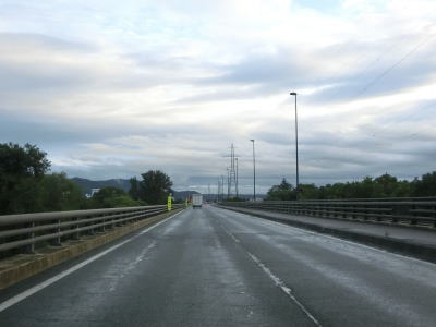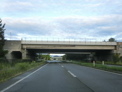 | 小幅交差点から程なくして岩手r16深持交差点を通過する。r16は交差点の前後にそれぞれS字状にカーブしているが、R46西バイパスが供用される際に交差する角度を直角に近づけるための措置だろう。 深持交差点を過ぎると左側車線が減少して対面2車線道路になるが、左側では多車線化工事が進行している最中であった。ただし、雫石川に架かる西大橋は新たな橋の架橋工事が行われておらず、多車線区間が延伸されても当分の間は橋の南までと思われる。 |