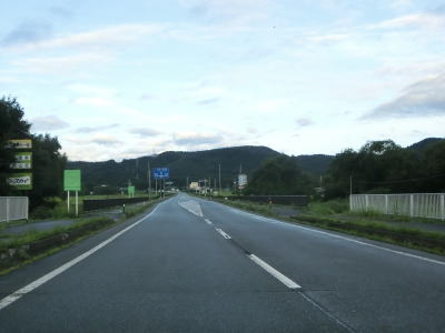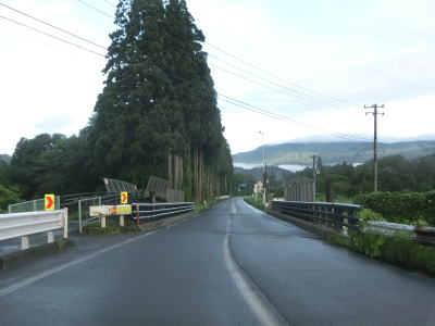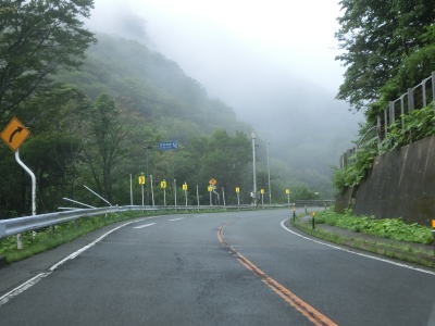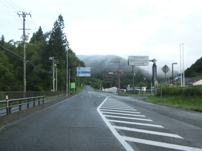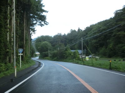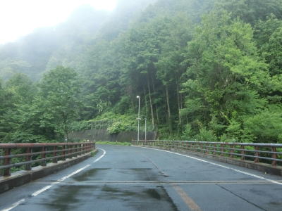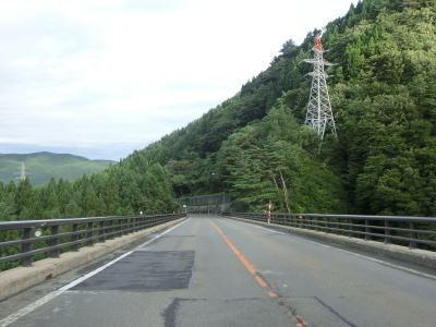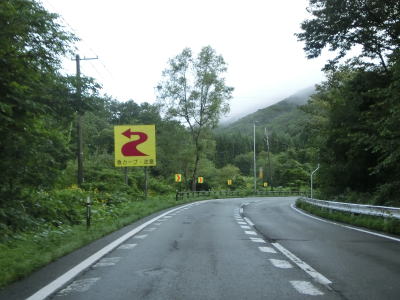 | 道の駅からも上り勾配の2車線道路が続いている。竜川に沿って左カーブを曲がり、しばらく右岸を走る。もしもしピットを通り過ぎた後に大平橋で左岸に移る。急カーブに注意を促す巨大な標識が設置されているが、その中の矢印ほど急なカーブではない。 | ||