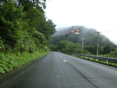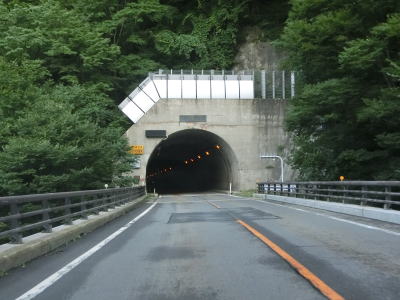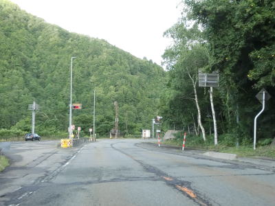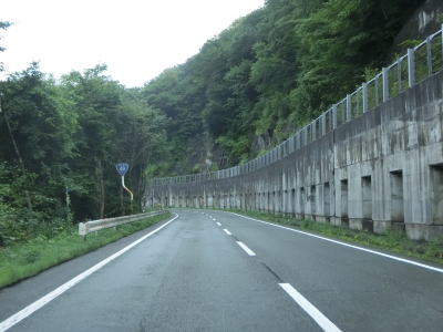 | 竜川の左岸を上って行くが、高低差が大きいため川面は一切見えない。反対側車線に設置された駐車帯を過ぎると高さ4.5mの制限バーをくぐるが、その直後には制限の要因のトンネル等は存在していない。直前に駐車帯がある事を考えると規制要因は仙岩トンネルで、駐車帯で転回させるために設置されているのではなかろうか。 | ||