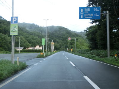 | 反対側車線の登坂車線が終わる(始点)にも制限高バーがあり、秋田県側もトンネルの直近には設置されていない。旧道らしき道路との交差点の直後に仙岩情報ステーションがあり、資料館は9時から17時までしか利用できないがトイレは24時間利用できるようである。 仙岩トンネル付近では離れていたJR田沢湖線(秋田新幹線)が接近してきて生保内こ線橋でオーバーパスする。跨線橋の西には仙北市の市役所(=旧田沢湖町役場)があり、さらに西には田沢湖駅もある。 |