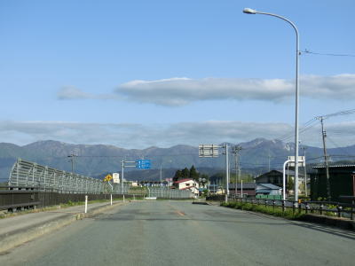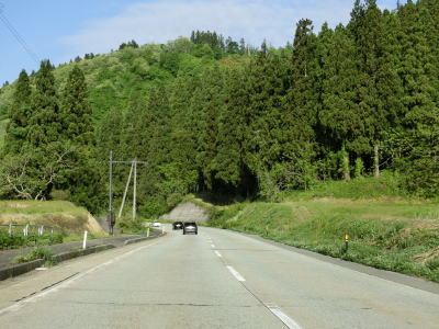 | 赤倉温泉駅付近の新田集落は融雪水パイプがセンターライン代わりの2車線道路となり、若干車線幅が狭く感じられる。新田集落を過ぎると普通の対面2車線道路に戻り、平坦でカーブの少ない状況を快走する。 | ||