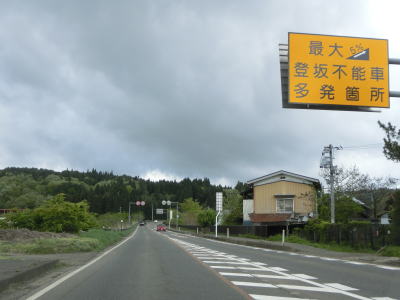 | 塔寺BP東交差点からは上り勾配となるが、登坂不能車が多発したようで大きめの警告看板が設置されている。最大勾配が5%なので特別急勾配という訳ではないが、二桁幹線国道故に荷物を満載した大型貨物車両の通行が多くそれらには5%の勾配でも厳しいのだろう。勾配が幾分か緩やかな場所で福島r43・r223塔寺駅入口交差点を通過する。案内標識にr43のヘキサしか表記されていないが、塔寺駅方面の道路はr223である。ウオッちずを確認すると交差点から約100m先でr43は屈曲しており、厳密に言うと塔寺駅入口交差点には接続していない。 | ||