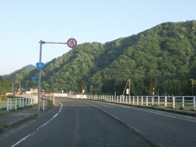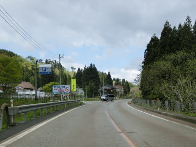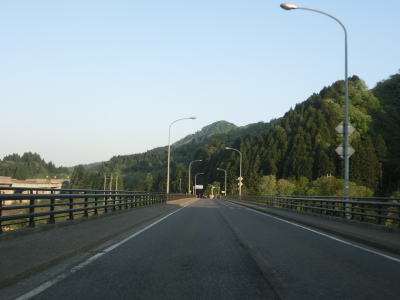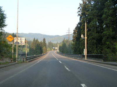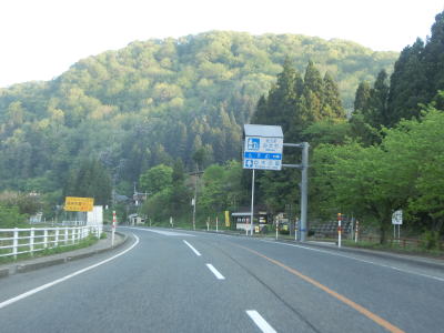 | 八木山集落を通り抜けると左にカーブしている見返大橋を渡り、音無川の右岸を下り続ける。カーブは多いものの緩やかなものばかりなので走りにくさはほとんど感じない。花立橋を渡った直後に国土交通省の津川除雪ステーションを通過するが、東隣には公衆トイレのある駐車場が設置されている。 | ||