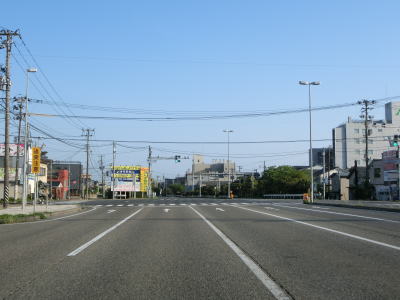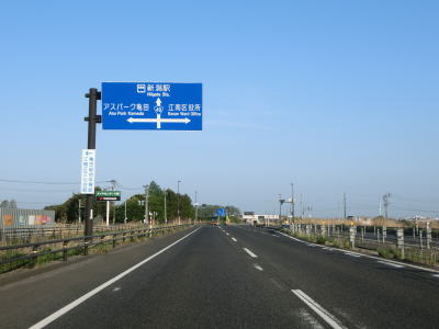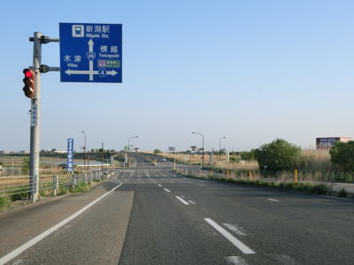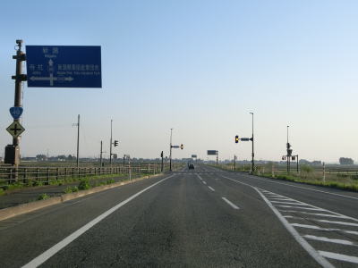 | 寺社交差点からも平坦で見通しの良い2車線快走路が続いている。新潟r590新潟東部産業団地入口交差点を通過して緩やかなS字状のカーブを曲がった後に新潟r286上堀越交差点を通過する。現在建設中の阿賀野バイパスが上堀越交差点の南に接続する予定である。 | ||