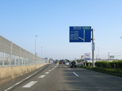 | E7日本海東北道の新潟亀田ICを通過する。これまで並走していたE49磐越道は約3.6km西の新潟中央JCT/ICでE7日本海東北道とE8北陸道と接続している。E7日本海東北道の亀田橋の下で新潟亀田ICの流出路と合流し、その直後に姥ヶ山ICを通過する。姥ヶ山ICからは沿線が住宅地のため遮音壁に挟まれており風景は全く見えない。 | ||