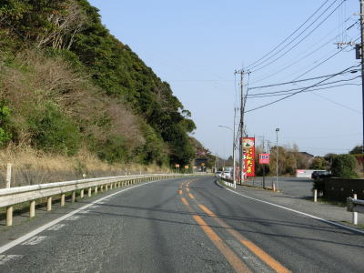 | 樅山交差点からは再び進行方角を北に変えるが、道路状況と風景に変化はない。子生集落に入ると歩道がなくなり、あっても非常に狭い歩道である。歩道が設置されて間もないと思われる場所や拡幅(歩道設置)用地と思われる空き地が確認できる。 | ||