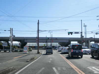 | E1名神の八木間橋の下をくぐり、程なくして緩やかな勾配を上って興津橋でJR東海道本線の上を通過する。跨線橋からの勾配を下り切って平坦になった所でR1現道と静清バイパスとの興津中町交差点に至る。高架道路がバイパスであり、手前の平面道路が現道である。富士方面に行くとすぐに現道とバイパスが合流しているせいもあって、富士方面のバイパスに入る事はできず、藤枝方面とのみ接続している。 | ||
