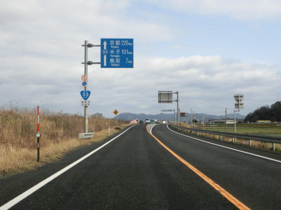 | 緩やかな右カーブを曲がって千代川と鳥取r500から離れる。平坦な片側2車線道路を走っているとR29・R373交差点を通過する。この交差点で左側車線がR29京都・米子方面への左折専用車線になってしまう。京都と米子はそれぞれ西と東の反対方向にあるが、R29を経てR9に進んだ方がR53で鳥取市街を通り抜けるより良いとの判断だろう。 | ||