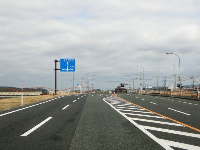 | 反対側車線と合流して対面2車線道路に戻ると右にカーブして新円通寺橋を渡る。南西側の橋の下には鳥取r500が通っているが、これは鳥取河原自転車道線という自転車道である。新円通寺橋を渡り終えて緩やかな勾配を下った後は千代川の右岸を走る。 | ||