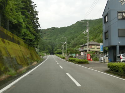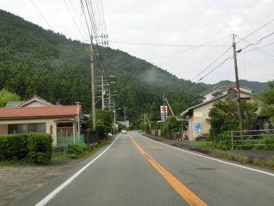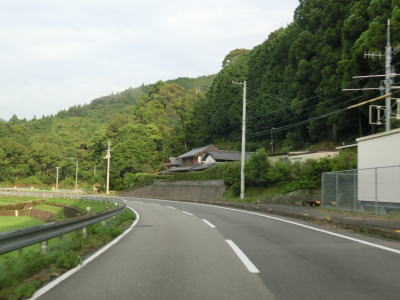 | 北河内谷川の左岸を下りながら家屋が点在する集落を通り過ぎる。周囲の家屋の数自体も少なく、そのうちのいくつかは定住者のいないものと思われる。家屋は少ないがお遍路のルートに当たるため歩行者が存在する可能性もあり、注意を促す看板が立てられている。 | ||