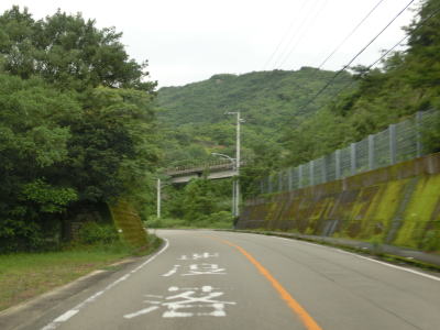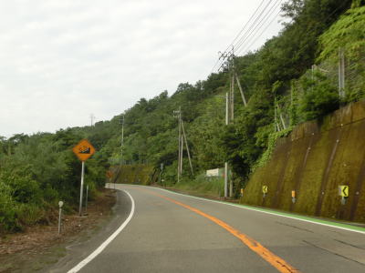 | 生見集落を過ぎると上り勾配となって砂浜から離れて相間トンネルをくぐる。トンネルからは下り勾配となるが、相間川を渡ると上りに転ずる。その後はアップダウンとカーブが連続する2車線道路を走る。 | ||