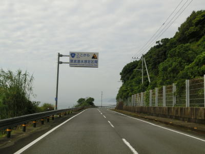 | 交通量の少ないシーサイドルートを走っていると再び津波浸水想定区間に入るが、この境目も道路状況に大きな変化がある訳ではない。野根交差点から約7.6km走ると市町境を通過して室戸市に入る。 | ||