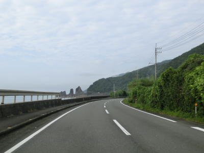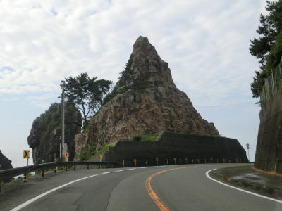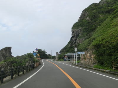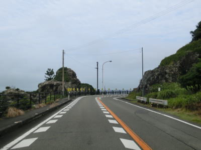 | 夫婦岩ドライブインの前を通過して少し進むと鹿岡鼻の根元を右の急カーブで通過する。この鹿岡鼻に夫婦岩がある。家屋が点在する集落を通り抜けながら淡々と2車線道路を走る。海が見えない場所を走っているが、津波浸水想定区間に含まれている。 | ||