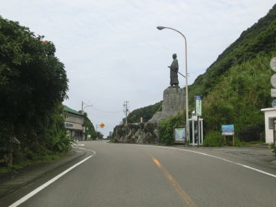 | ディープシーワールドの前を通過し、さらに走っていると白い像の前を通る。この地に所縁のある空海の19歳の頃の姿のようである。その像からさほど走らないうちに御厨人窟の前を通るが、この窟は空海が居住したとされている。さらに海岸線に沿った2車線道路を走っていると室戸岬灯台への徒歩道との交差点を通過する。灯台はR55から見て海側ではなく内陸側の高い位置に建てられている。 | ||