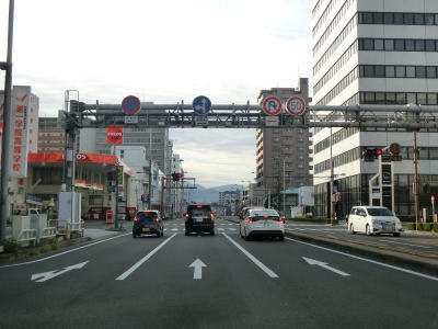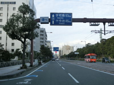| 1.R11・R33・R317・R379・R440・R494松山市役所前交差点 | 2.「宇和島93km R196今治46km」 | 3.南堀端交差点 |
