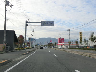 | 伊予市の市街地の手前でR378伊予警察署前交差点を通過する。この交差点はR378の起点であり、終点もR56との交差点である。内陸部を通るR56に対してR378は海沿いを通っているため起終点間の距離には大きな差がある。 伊予警察署前交差点からは市街地を通るR378と並走状態となりながら南の方角に向かって走る。JR予讃線を越える伊予跨線橋を過ぎてからも片側2車線道路をが続いている。市街地の近くを通っているが、バイパスとあって走りやすい道路状況である。 |