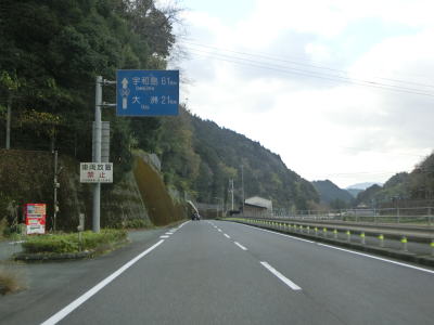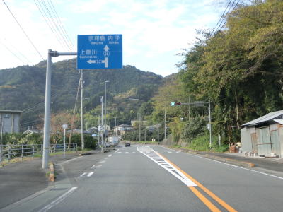 | 旧中山町の中心部を過ぎると中山川沿いの谷筋を走っており、対岸にはJR予讃線が並走している。カーブは多いが緩やかなものがほとんどで勾配も緩やかなのでおおむね走りやすい道路状況と言える。二桁国道とあって山間部の割に交通量は多いがストレスを感じない程度に流れは良い。峠でも何でもない場所で市町境を越えて内子町に入る。 | ||