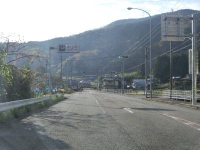 | 道の駅を過ぎてすぐに愛媛r307交差点と愛媛r225交差点を相次いで通過する。その後は中山川の谷筋を走っており沿線の家屋がほとんどない状態となる。川に沿っているためカーブは多いがヘアピンカーブのような急カーブはなく、勾配もほとんどないため走りにくさはあまり感じない。伊予中山駅の前で愛媛r226交差点を通過して旧中山町の中心部に差し掛かる。 | ||