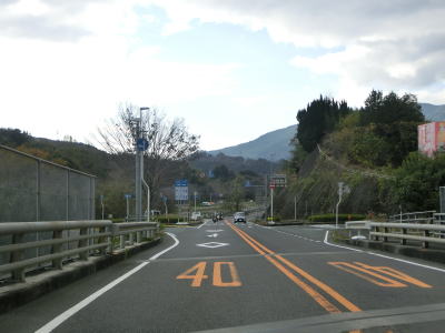 | E56松山道の伊予ICを過ぎて少し走ると右側車線が減少して対面2車線道路になる。終点の松山市役所前交差点から続く多車線区間の距離は約14.3kmである。2車線道路になると同時に緩やかな上り勾配となり、程なくしてE56の伊予高架橋の下をくぐる。さらに勾配を上っているとJR予讃線の高架をくぐる。予讃線は内陸と海沿いのルートに分かれており、ここでくぐったのは内陸ルートである。 | ||