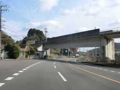 | 高知r336交差点を通過してすぐに旧道と合流する。ウオッちずではr336は旧道より北の区間しか県道扱いされていないが、案内標識はバイパスに交差しているように表記されていた。バイパスが終わってからも比較的走りやすい2車線道路が続いており、右カーブを曲がって土佐くろしお鉄道の下をくぐる。 | ||