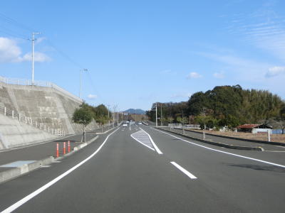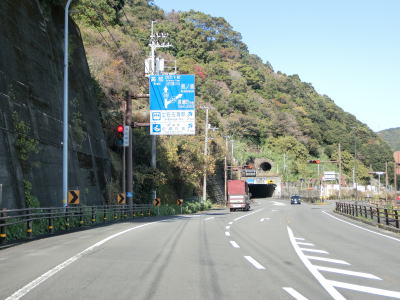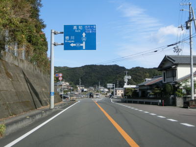 | 古津賀川に沿った緩やかな上り勾配の2車線道路を走る。沿線の商業施設はなくなり交通量も減少しているが、二桁国道なので車両が全く走っていない状態にはならない。逢坂トンネルをくぐると黒潮町に入る。 | ||