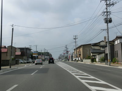 | 「みねはま」を通過した直後に市町境を通り過ぎて能代市に入る。青い森公園前交差点からは約147kmと総延長の半分をやや過ぎているが、市町村としてはちょうど中間と言える。秋田r209から先は両側に家屋が建ち並んでおり若干狭苦しく感じられる。秋田r143能代球場入口交差点からは造成された住宅地を走っており、両側に歩道のある走りやすい道路状況になる。もっとも市街地に近付いているため交通量はだいぶ増えている。 | ||