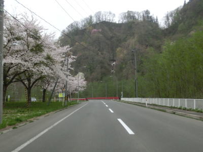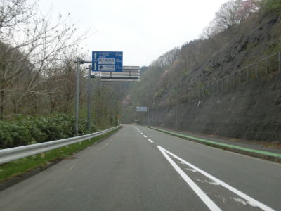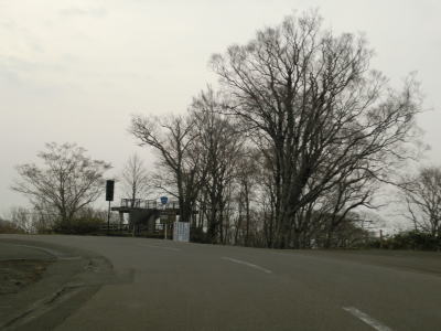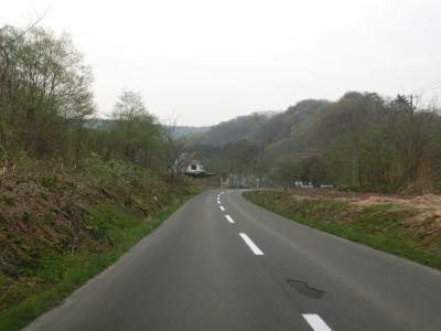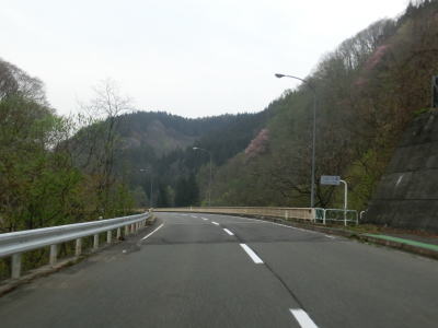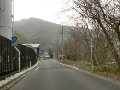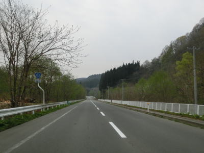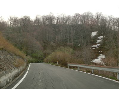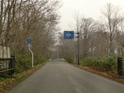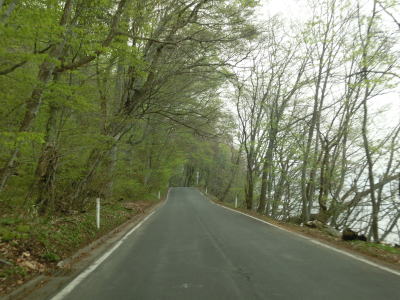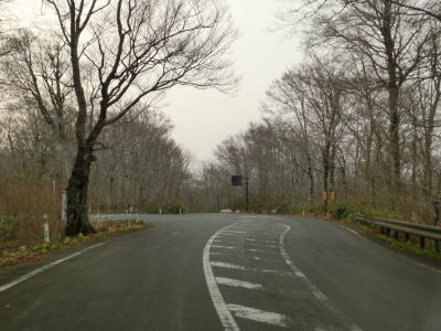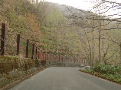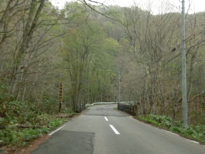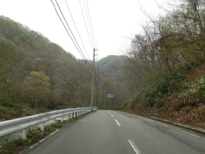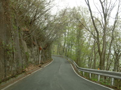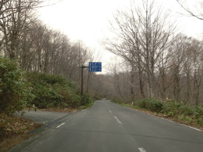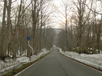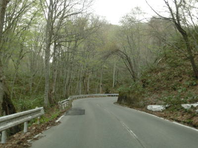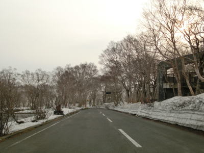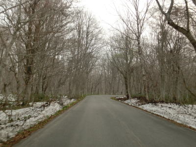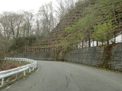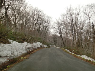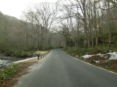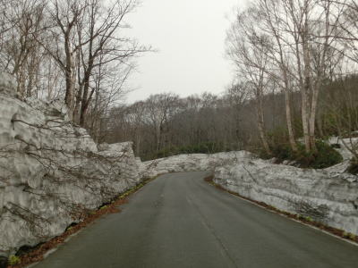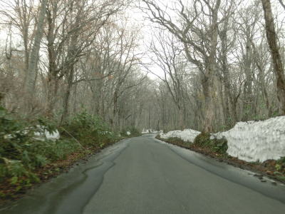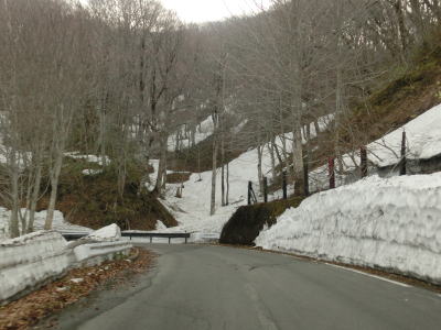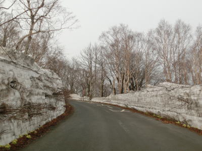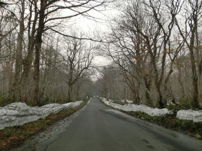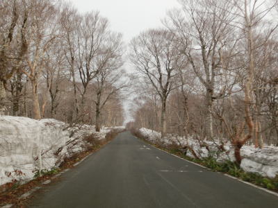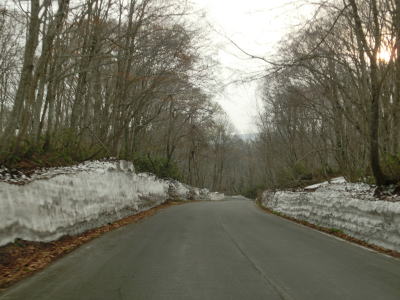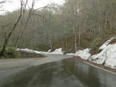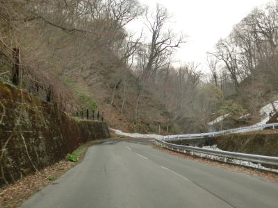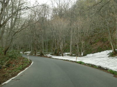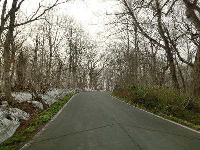| ヘアピンカーブをいくつか通過して浅瀬石川の源流の沢を過ぎると直線的な道路になる。道路の両側には1m程の高さの残雪があり、かなりの量の雪解け水が路肩を流れていた。木々も葉が落ちた状態だが、走行したのは5月2日と関西や関東では桜は完全に散り、新緑がまぶしい時期である。 | ||