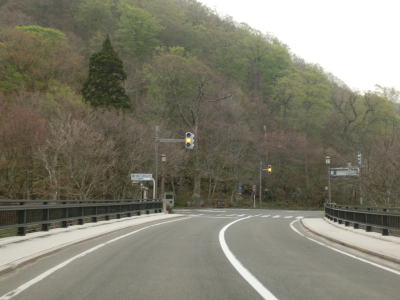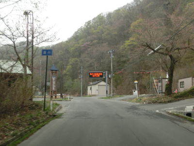 | 温川集落を過ぎると残雪が目立つようになってくるが、冬季閉鎖は既に解除されており路上には全く残っていない。温川橋を渡った直後に閉鎖用のゲートが設置されている。おそらく冬季閉鎖地点と思われる。 | ||