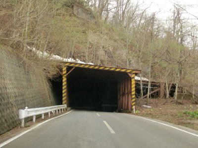 | 右の急カーブを曲がった先でスノーシェッドに入るが、その内部は右のヘアピンカーブとなっている。シェッドを出て左ヘアピンカーブを曲がると2つ目のシェッドを通過する。その後しばらく小刻みにカーブしている下り勾配の2.0車線道路を走り、3つ目のシェッドをくぐる。走行した日は内部で工事が行われており、片側交互通行規制が敷かれていた。 | ||
