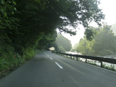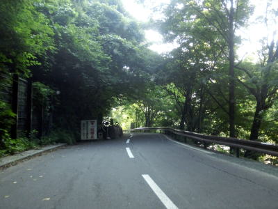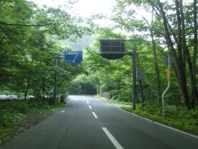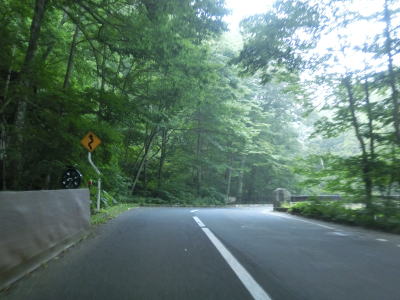 | 惣地交差点から先も2車線道路が続いているが、渓流沿い=谷筋のため薄暗い印象を受ける。所々でセンターラインがなくなる箇所があり、ハイキングコースにもなっている渓流に近接しているとあって付近に集落等がないにもかかわらず歩行者がいる事もあるので油断できない。現道の南半分も同じ渓流沿いではなるが幾分か走りやすい道路状況である。 | ||
