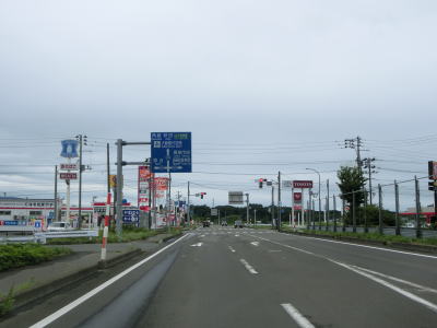 | 1.R7大堤交差点 | 2.「角館100km 森吉18km 大館能代空港 E7秋田道10km」 | 3.車線幅の広い2車線道路 |