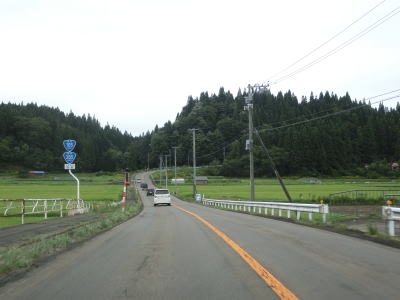 | 諏訪岱交差点からも2車線道路が続いている。意外にも直進してR285に進む車の方が多いため交通量が少なくなる。寄延沢付近に8%の急勾配区間があるがそれ以外の勾配は緩やかで走りやすい道路状況である。阿仁川の左岸を走っていると秋田r111との交差点を右にカーブして通過する。交差点付近はセンターラインが消えかけているが2車線道路である。 その後も阿仁川の左岸を走っており阿仁前田集落を通り過ぎて秋田r214・r309阿仁前田交差点を通過する。上小阿仁村方面のr214、太平湖方面のr309どちらもくまげらエコーラインという愛称が付けられている。 |