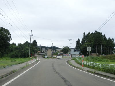 | 谷筋から開けた所で市道との交差点を通過する。右折すると根子集落へ行く事ができ、左折して笑内集落を通り抜ける道路は旧道と思われる。市道との交差点からは阿仁川に流れ込む沢をいくつか渡りながら左カーブを曲がる。新鳥坂橋を渡って6%の勾配を下った先で旧道との交差点を通過する。 | ||