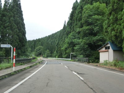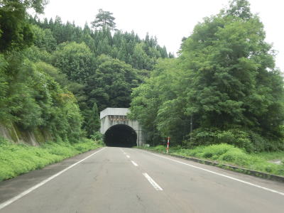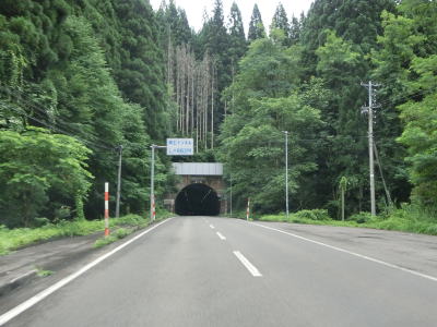 | 茶屋庫トンネルを出てすぐに旧道との交差点を通過するが、以降も走りやすい2車線道路が続いている。喜鵲橋以南は秋田内陸縦貫鉄道と同じ阿仁川の右岸を通っており、荒瀬駅の前を通過する。秋田内陸縦貫鉄道と並走しながら南下を続けていると阿仁トンネルをくぐる。トンネルの手前には「阿仁トンネル L=862M」という標識が立っているが、これは正確ではない。阿仁トンネルは1号から3号まで3つのトンネルがあり1号と2号、2号と3号がそれぞれロックシェッドで繋がっているためひとつのトンネルとして扱われているようである。 | ||