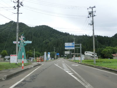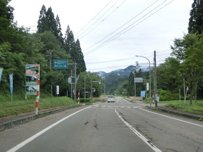 | 秋田内陸縦貫鉄道のトンネルの上を2回通るがその間はやや急なカーブである。秋田内陸縦貫鉄道と並走していると前方にかつて大阿仁村の中心部だった集落が見えてくる。比立内駅の南を通過した後に秋田r308交差点を通過し、道の駅「あに」の前を通る。実は大堤交差点からR105に入った直後の案内標識の支柱に47.7km先と案内されている道の駅である。50km近く手前から案内されても…という気がしないでもない。同じ支柱にある「かみこあに」と「ひない」もそれぞれ26.1km、25.9kmと結構な距離がある。新牛滝橋を渡った南詰でr308交差点を通過して短い重複区間が終わる。 | ||