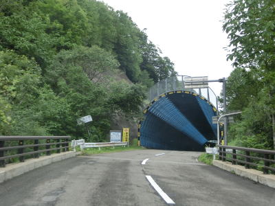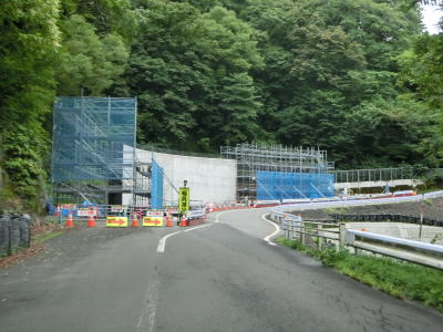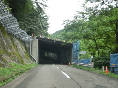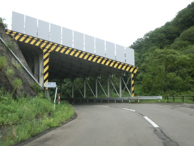 | ロックシェッドの建設現場を過ぎてすぐに繋沢スノーシェッドをくぐり、法面の土砂崩れの復旧のための片側交互通行規制箇所を通過する。その後、大覚野2号スノーシェッド、繋沢ロックシェッド、万内森2号スノーシェッドをくぐる。 | ||
