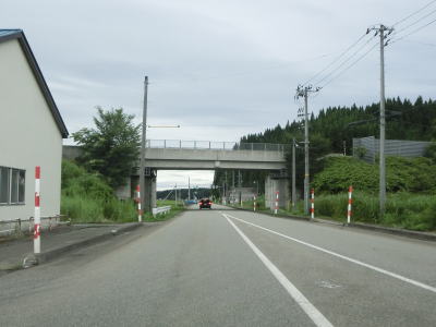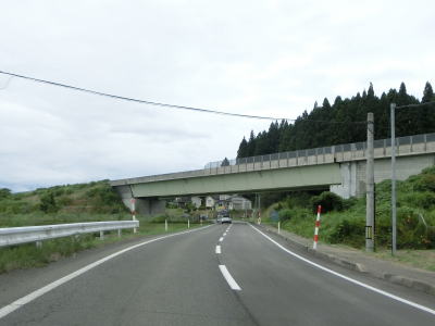| 道の駅を過ぎてすぐにE7日本海東北道の大内ICを通過する。“E7日本海東北道の大内IC”と記したがこれは正確ではない。正確には日本海東北道の大内JCTに接続しているR105岩谷道路の大内ICであるが、E7日本海東北道方面しか供用されていない。案内標識にも岩谷道路の名は一切出ておらず普通に走っている分には岩谷道路の存在には気付かないだろう。日本海東北道を走っていれば単なるインターなのに“大内JCT”となっているのに違和感を覚える人がいるかもしれない程度である。なお、岩谷道路は僅か800m程度だが、地域高規格道路の本荘大曲道路の一部である。 大内ICを過ぎて少し走るとE7日本海東北道の興梠橋の下をくぐり、芋川の左岸の平坦な場所を走る。多少のカーブはあるものの緩やかなものばかりで非常に走りやすい道路状況と言える。 |