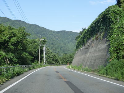 | 中の橋と長瀞橋で梵字川を渡るが、橋の間に道の駅「月山」がある。左岸にスノーシェッドが見えるが、2つの橋を含むバイパスが供用される前の旧道であろう。長瀞橋からは梵字川の左岸をゆっくりと下って行く。視界が開けると集落に差し掛かる。 | ||