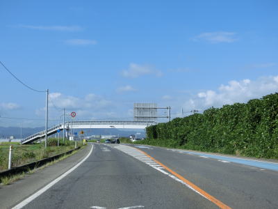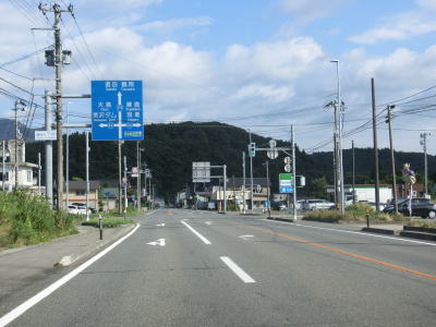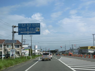 | 片側2車線道路を走っていると緩やかな勾配を上って鶴岡高架橋でJR羽越本線の上を越え、跨線橋の勾配を下り切った所でR7・山形r47中野京田交差点を右折して湯野浜・大山方面に進む。r47鶴岡市役所方面はR7鶴岡バイパスが供用される以前はR112だったと思われる。 | ||