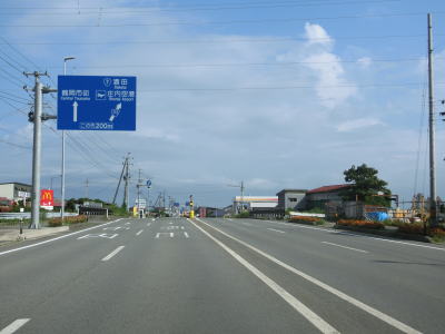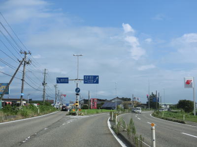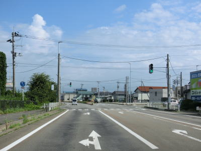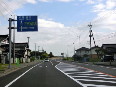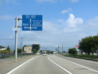 | 4車線道路を走っていると山形r350外内島交差点を道なりに右へ進む。左側車線はr350鶴岡市街方面になるため、国道をトレースできるのは右側車線だけである。対面2車線道路に戻った直後にR345外内島交差点を通過する。案内標識には表記されていないが、この交差点から北はR345が重複している。 | ||