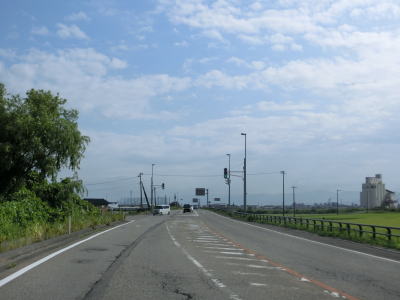 | 大宝寺町交差点からも片側2車線道路が続いており、少し進むとJR羽越本線の跨道橋をくぐる。勾配は緩やかで前後の高低差も小さいが川のすぐ傍のため浸水時の進入禁止バーが設置されている。 大きく左にカーブして進行方角を西に転じた直後に山形r350道形町交差点を通過する。左折のr350は鶴岡市の中心部を通り抜けており、R7の鶴岡バイパス供用後のR112の旧道に当たる。少し走ると今度は右カーブを曲がって進行方角を北に戻す。 |
