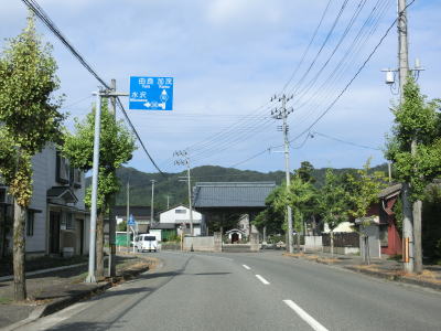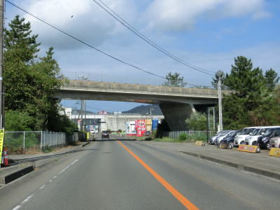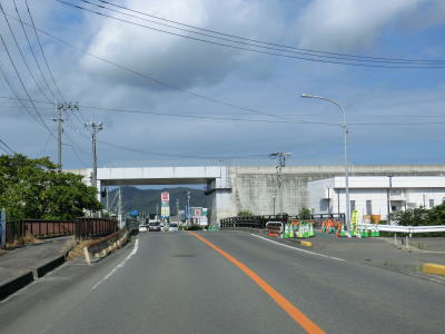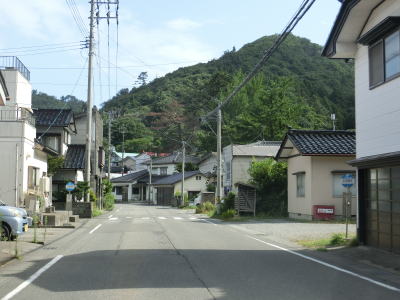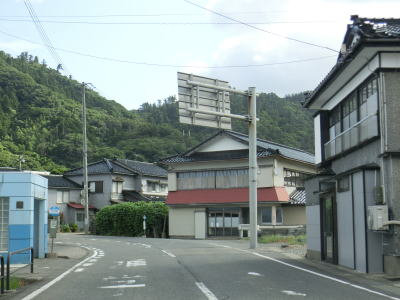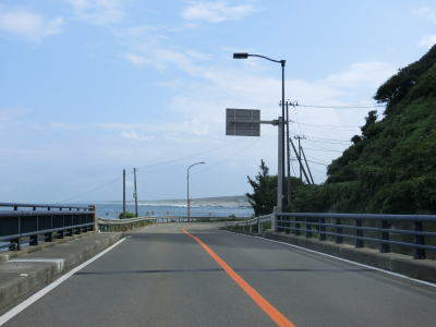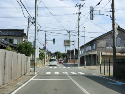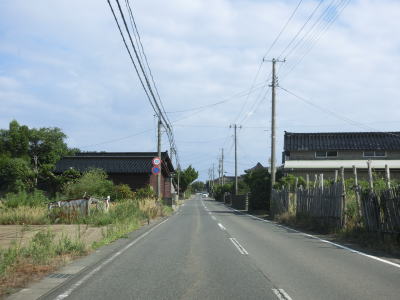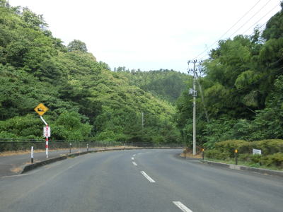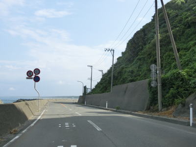 | 防風林と果樹園に挟まれた状態が続くが、十里塚集落は両側に家屋が存在している。宮野浦集落に向かう市道との交差点を右にカーブしながら通過すると海岸から離れて緩やかな勾配を上る。 | ||